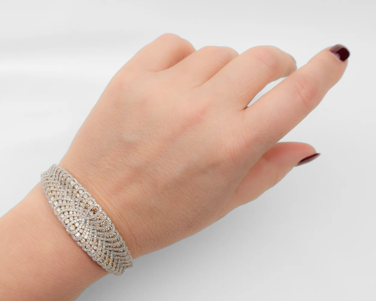 Circa 1980. This stunning 14KT gold hinged, bangle-style bracelet features a looping design, channel set with 169 graduated, round brilliant-cut champagne diamonds. These diamonds weigh 8.45 carats in total with VS2-SI1 clarity and light champagne color. The loops are outlined with a total of 452 scallop-set, round single-cut diamonds. These diamonds weigh 1.80 carats, with SI2-I1 clarity and G-H color.