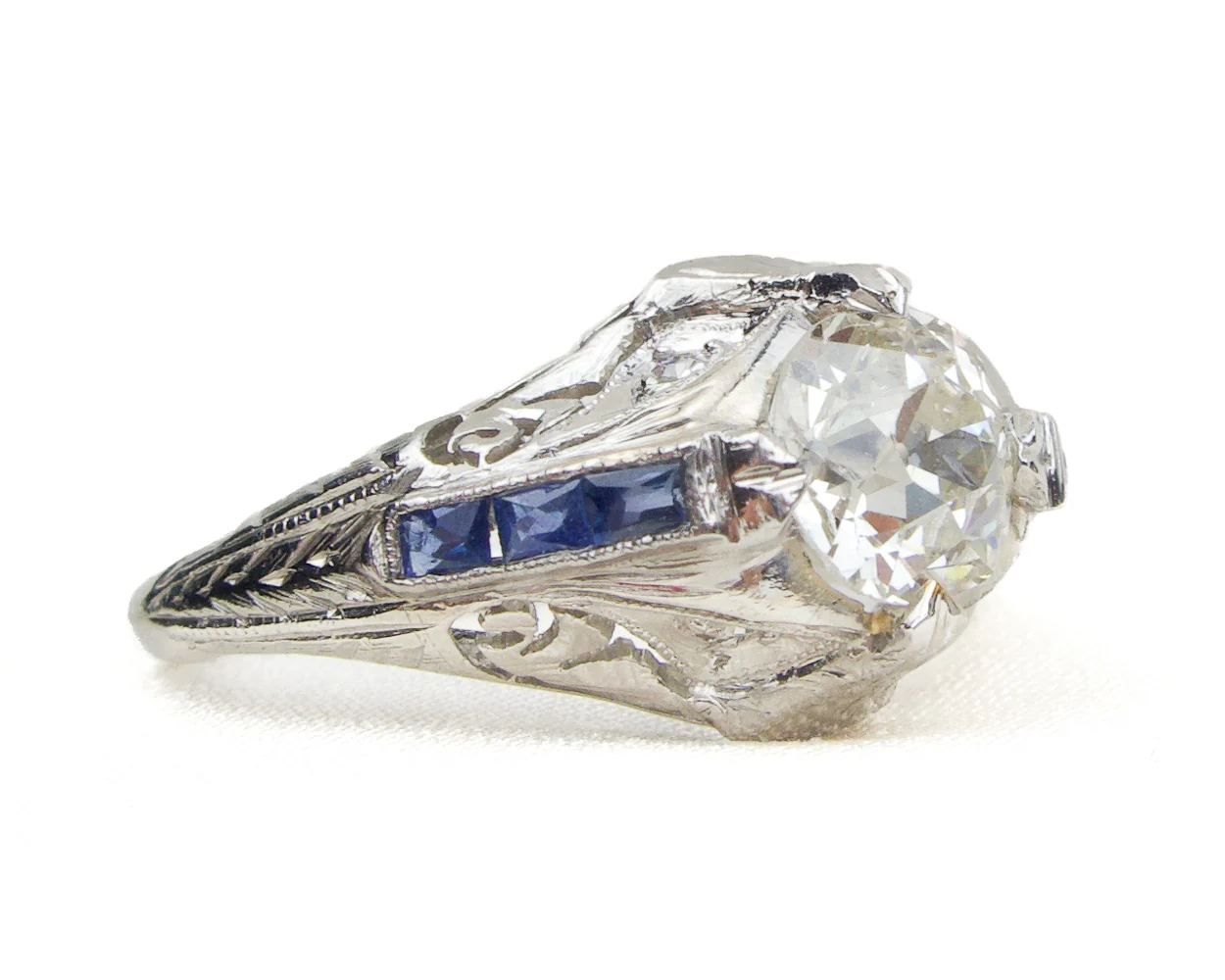 Circa 1920. This fabulous Art Deco Era platinum ring features a 1.23-carat round old European-cut diamond with SI1 clarity and K color. Accenting the center stone are four old European/single-cut diamonds and six rectangular French-cut synthetic sapphires. The pierced design is engraved with wheat motifs and bordered with milgrain edging.