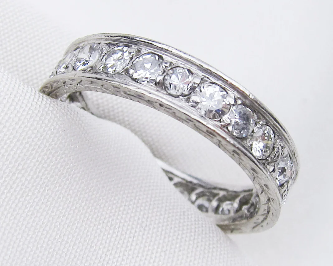Circa 1930. This lovely 18KT white gold Art Deco eternity band features 24 bead-set, round mixed-cut diamonds weighing 1.24 carats total. The diamonds exhibit SI1-SI2 clarity and F-G color. Engraved wheat motifs accent the side faces of the band. The ring is approximately a size 6.5.