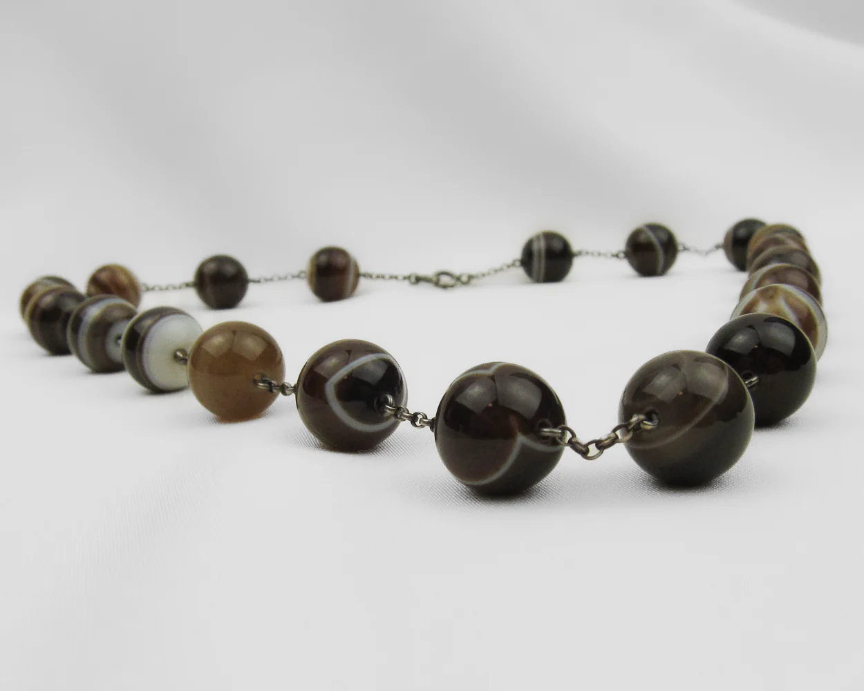 Circa 1890. This beautiful Victorian necklace features banded agate beads on a silver chain. Banded agate was quite fashionable during the Victorian Era. These translucent gemstones were often used as talismans and were known as stones of protection.