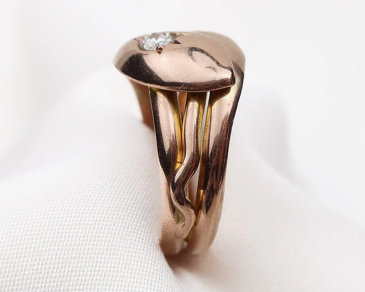 Dated 1918; Chester, England. This beautiful Edwardian-era ring features two entwined snakes crafted from 9KT rose gold. One snake is adorned with a ruby, the other, a diamond. Snake rings were all the rage after Queen Victoria was given a snake engagement ring from Prince Albert, symbolizing eternal love.