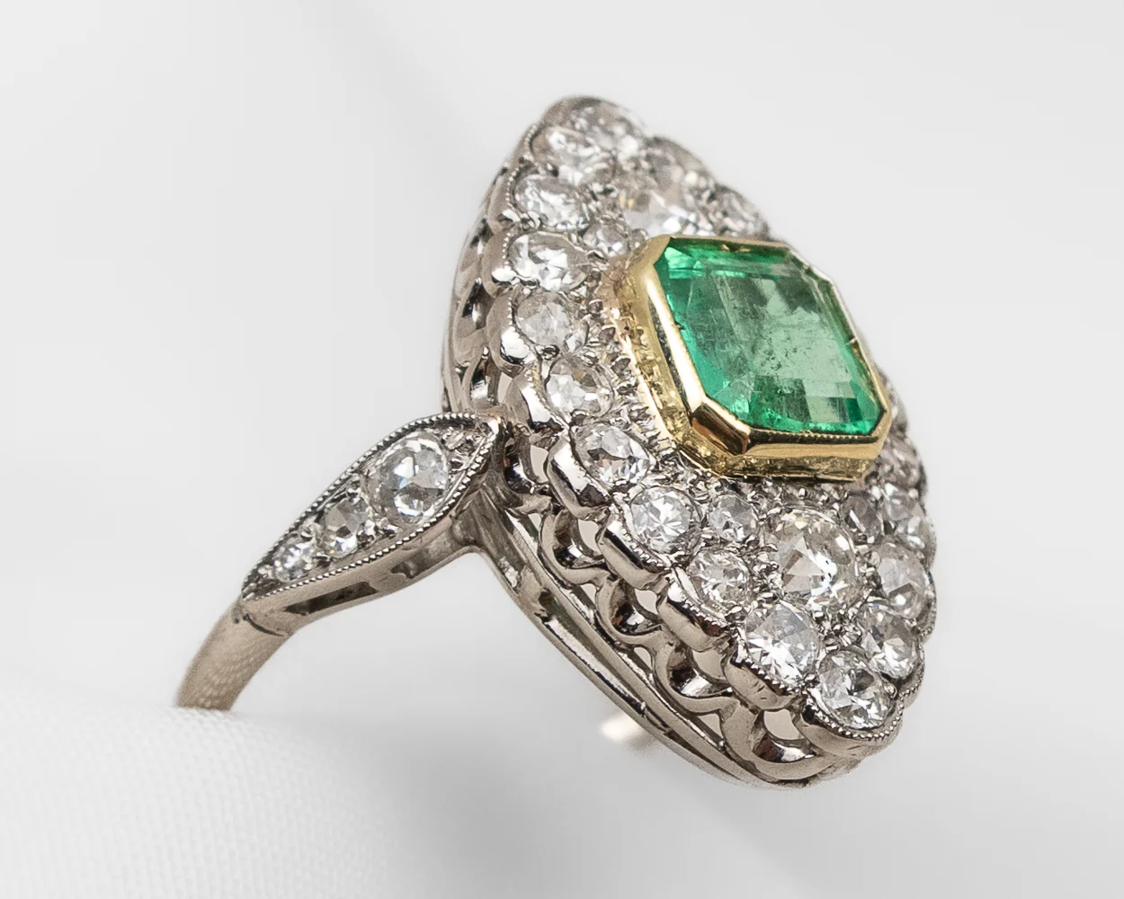Circa 1950. This stunning Midcentury platinum ring features a .90-carat, emerald-cut natural emerald set into an 18K yellow gold bezel. The navette-shaped gallery features a scalloped edge and is accented with 26 bead-set, old European/single-cut diamonds. Each shoulder of the ring is accented with three bead-set, old European/single-cut diamonds. The diamonds weigh 1.13 carats total, with SI2-I1 clarity and G-H color.