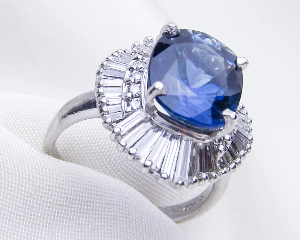 Circa 1950. This stunning platinum ring features a beautiful, brilliant blue 5.85-carat cushion mixed-cut faceted sapphire with no heat treatment. This fantastic stone is surrounded by 40 baguette diamonds radiating from the center stone in "ballerina skirt" fashion and 10 round brilliant-cut diamonds accenting each side of the sapphire. The baguette-cut diamonds weigh .95 carats total, with SI1-SI2 clarity and E-F color. The brilliant-cut diamonds weigh .10 carats total, with SI1-SI2 clarity and F-G color. The ring is approximately a size six and can easily be sized. "PT900 D095" is stamped on the inside of the shank.