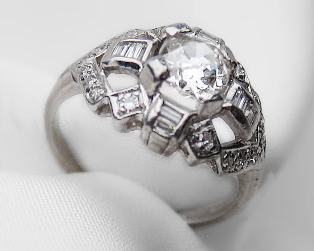 This striking circa 1950 diamond ring features a central old European-cut diamond set in platinum. The center stone weighs .56 carats with I1 clarity and J color. Accenting the center diamond are eight baguette-cut diamonds, weighing .15 carats with an SI1-SI2 clarity range and G color. There are also 18 round single-cut diamonds weighing .20 carats total, with an SI1-SI2 clarity range and F-G color range.