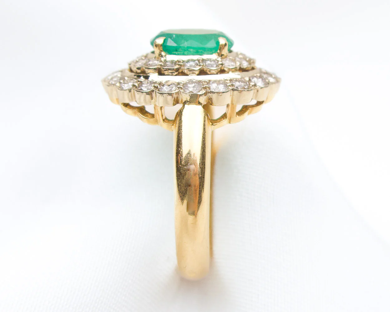 Circa 1950. This fabulous 18KT gold French ring features a 1.50-carat oval mixed-cut natural emerald set into a four-prong setting. The emerald is bordered with a double-tiered halo of 36 bead-set, round brilliant-cut diamonds. The diamonds weigh .72 carats in total, with SI2-I1 clarity and I-J color.