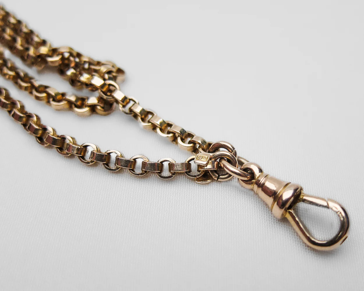 Circa 1889; Chester, England. This beautiful Victorian English chain features 2mm 9KT rosy-gold circular links. The chain measures 56 inches in length - perfect to double. The large dog clip makes it easy to add your favorite fob or locket.