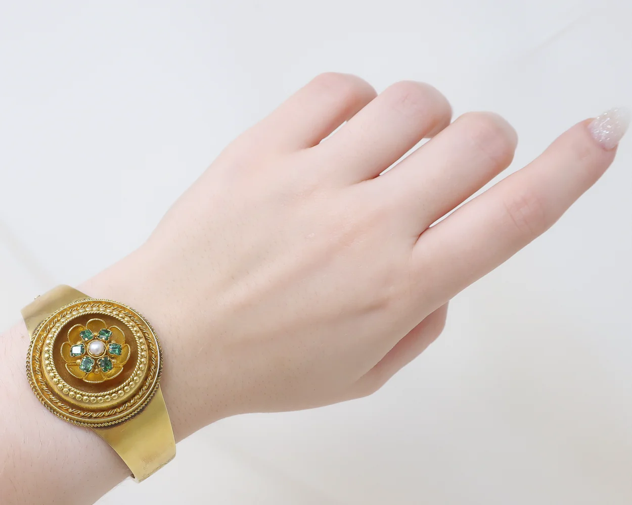 Circa 1860. This fabulous Victorian 15KT gold bracelet features an Etruscan Revival motif accented six prong-set, foil-backed green beryls, and one bezel/prong-set creamy white pearl. Etruscan Revival jewelry was prominent in the mid-to-late 1800s and was inspired by the discovery of Etruscan tombs in Italy at the beginning of the century.