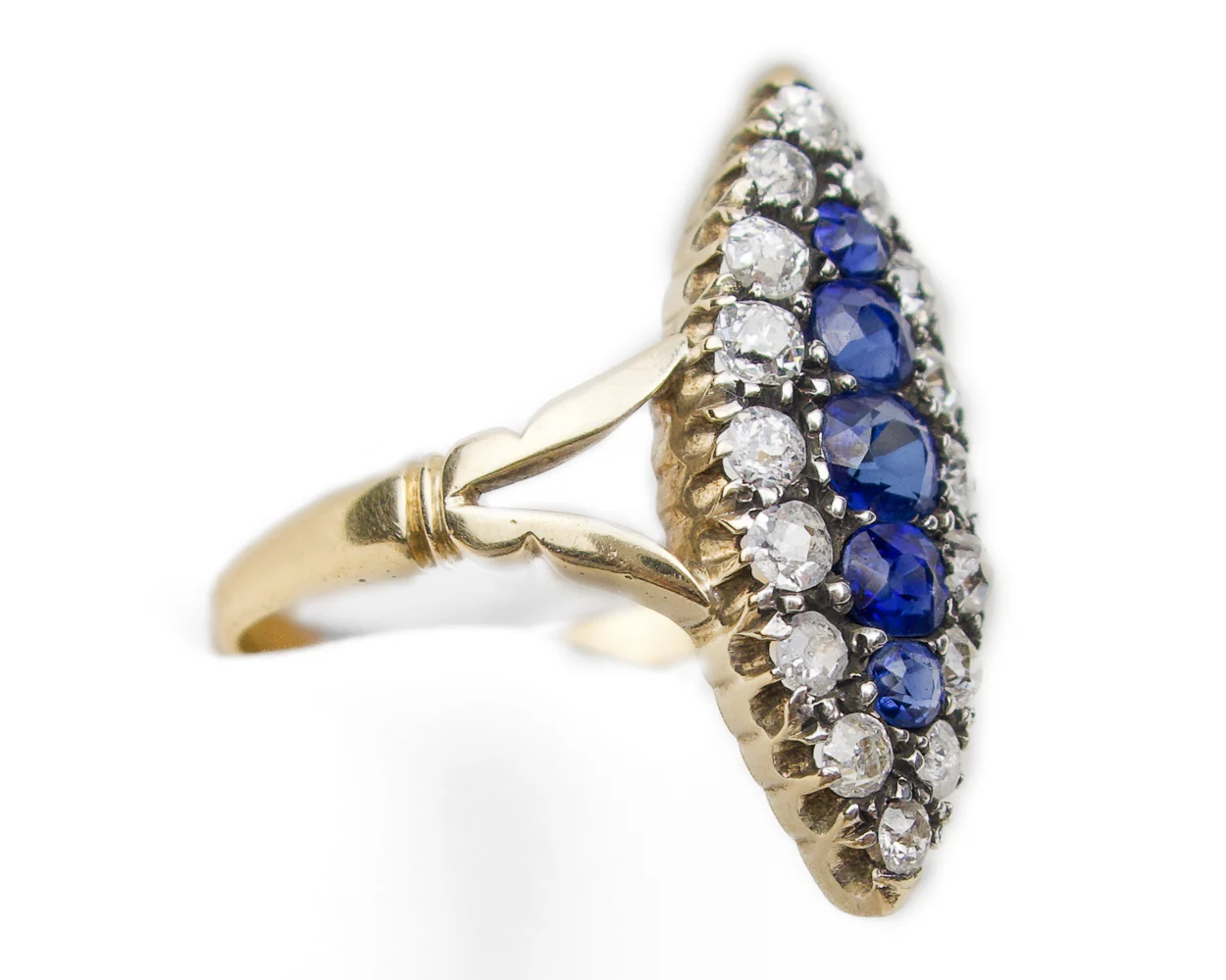 Circa 1900. This beautiful 18KT yellow gold Victorian navette ring features a central row of five prong-set, oval mixed-cut natural blue sapphires bordered with 16 prong-set, old European-cut diamonds. The sapphires weigh 1.24 carats in total. The diamonds weigh .80 carats in total, with I1 clarity and F-G color.